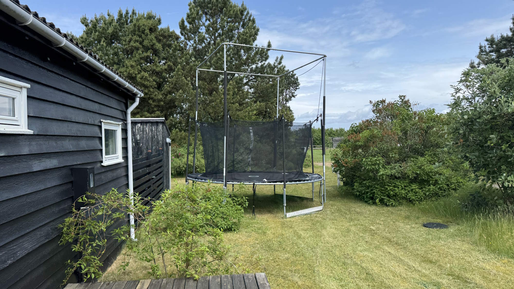 Græsset er højt og der er ukrudt. Der giver et vældigt liv af små insekter og fremmer dyrelivet i området. Du må imidlertid gerne slå græsset (og ukrudtet), hvis du vil bruge hele eller dele af haven til leg.
