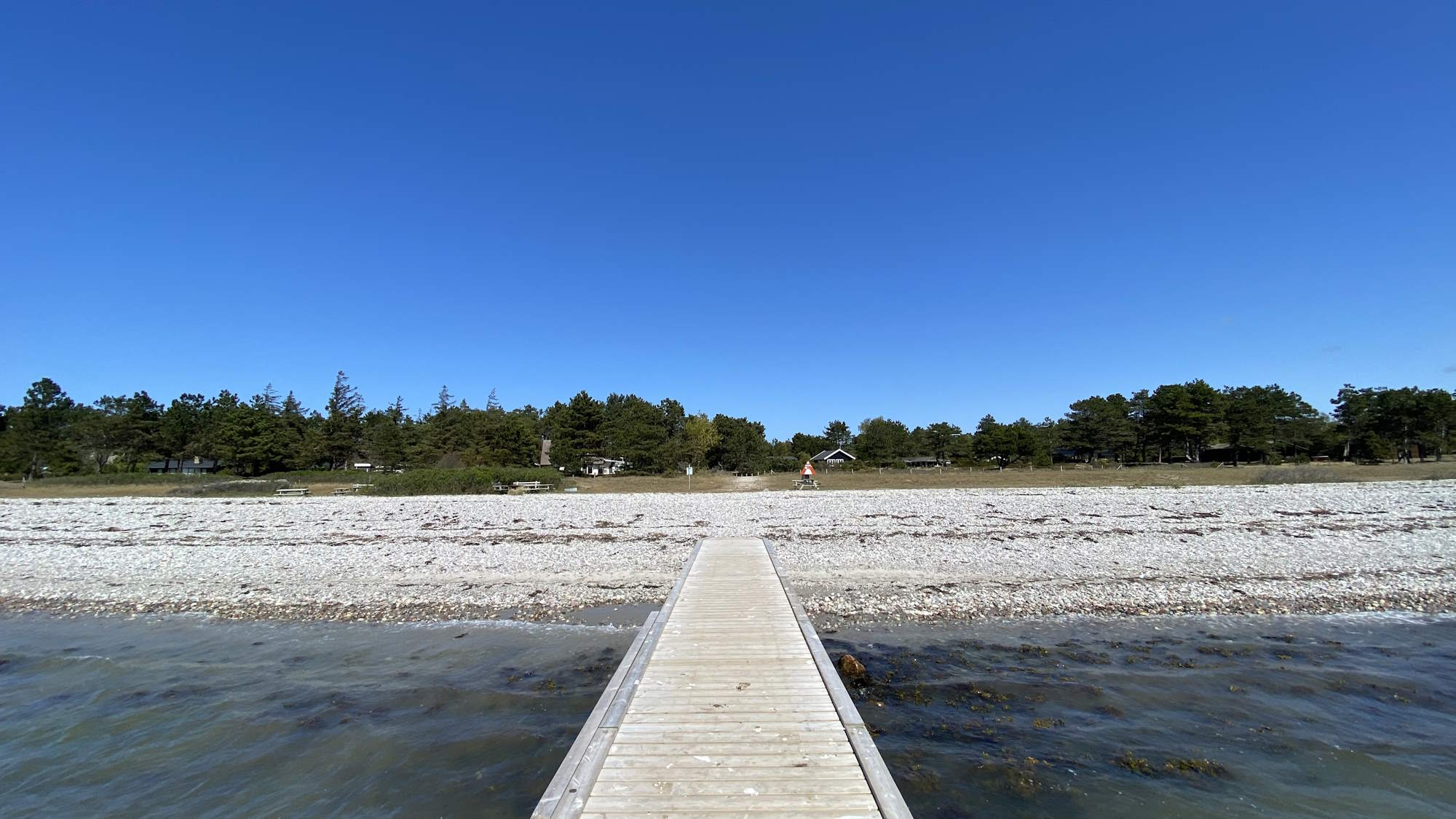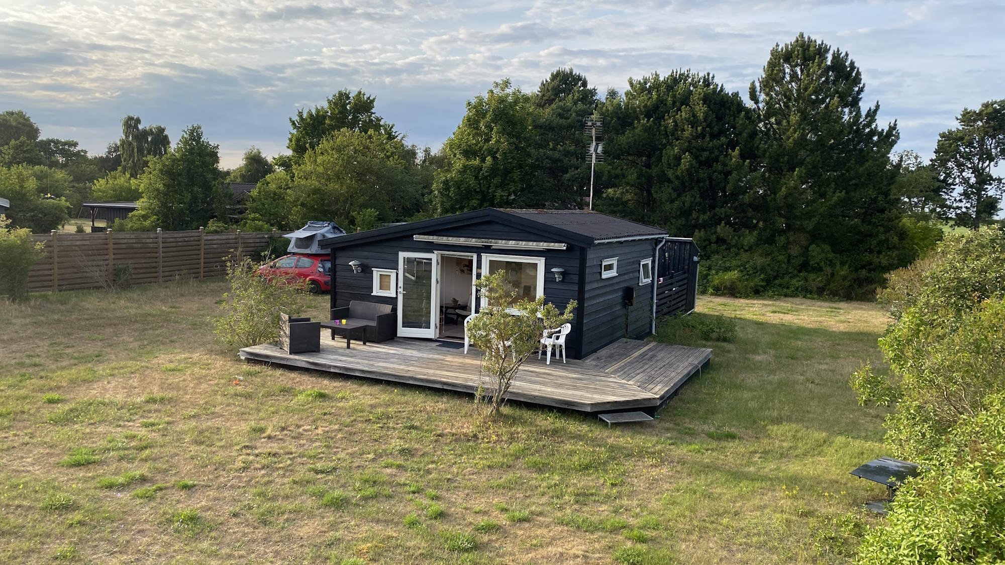 Sommerhuset ligger – populært sagt – i “anden række” til Oddenvejen. Det betyder, at du kan høre bilerne fra færgetrækket op til 11 gange om dagen i højsæsonen. Sidder du i gården eller på træterrassen i “læ” af sommerhuset, er det dog ikke noget, som man normalt bliver generet af – og er du indendørs, høres bilerne ikke.