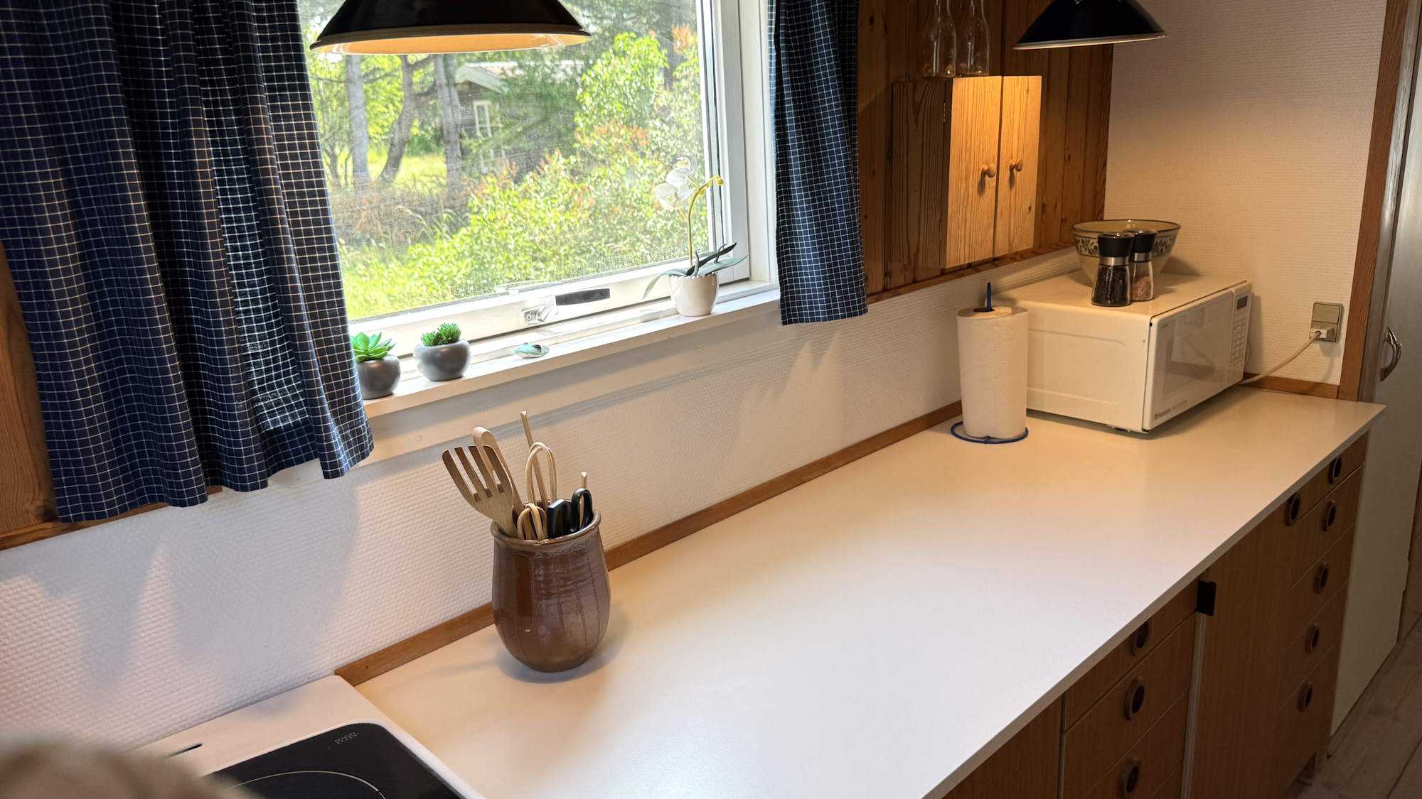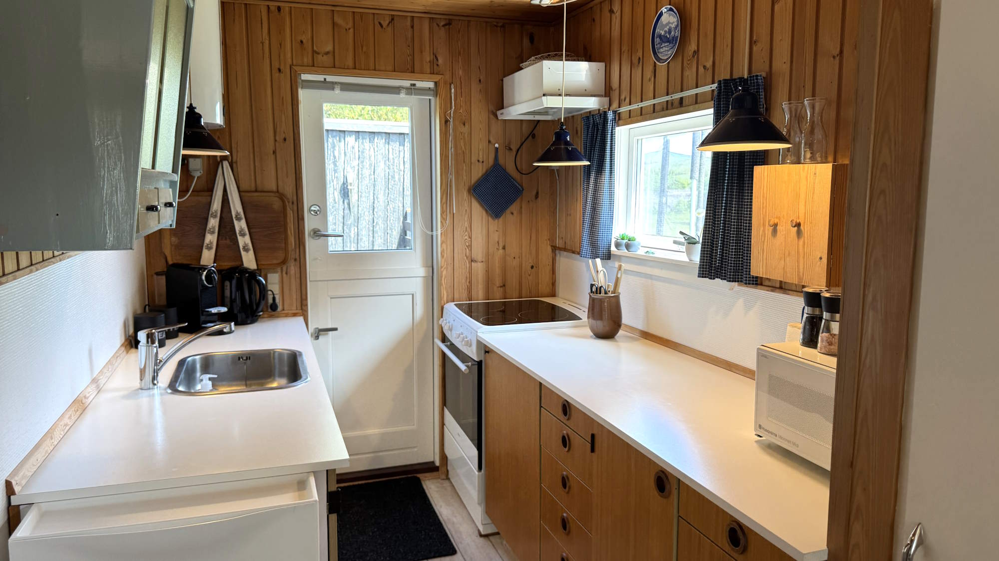 Der er en microbølgeovn, Nespresso kaffemaskine, elkedel, brødrister, mælkeskummer – ja selv en elektrisk håndmixer og køkkenvægt, som du kan bruge sammen med kagerullen, hvis du vil bage... Der er masser af tallerkner, glas, kander, bestik, fade, gryder, pander og tilbehør til grillen.
