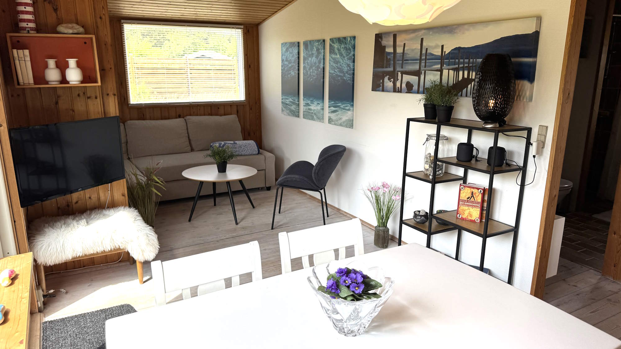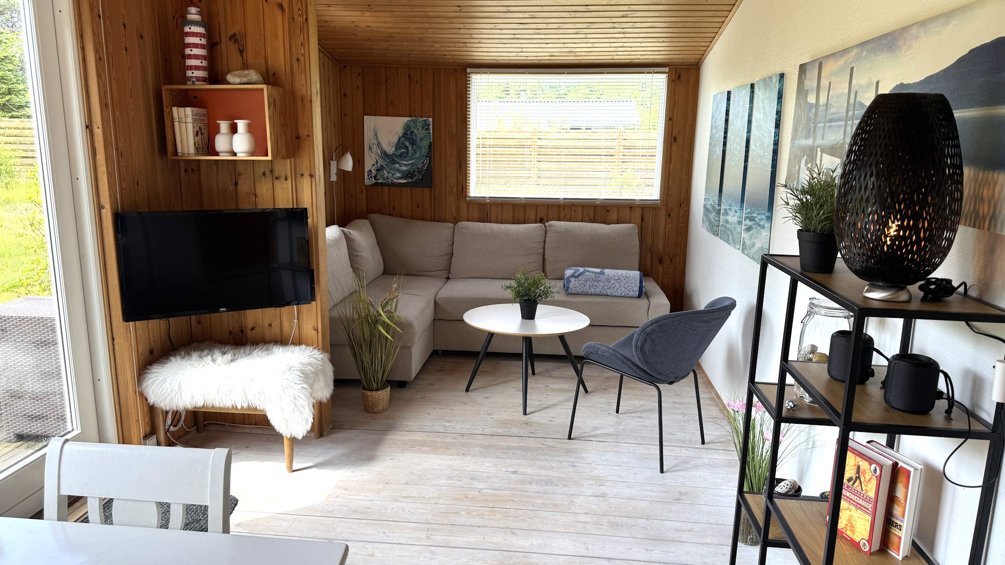 I stuen er der desuden TV, lænestol, reol, sofabord samt en sovesofa, der slås ud til 140 x 200. Mellem stuen og køkkenet er et højskab med bl.a. en støvsuger, Jumbobøger, ventilator, kikkert og en masse spil.