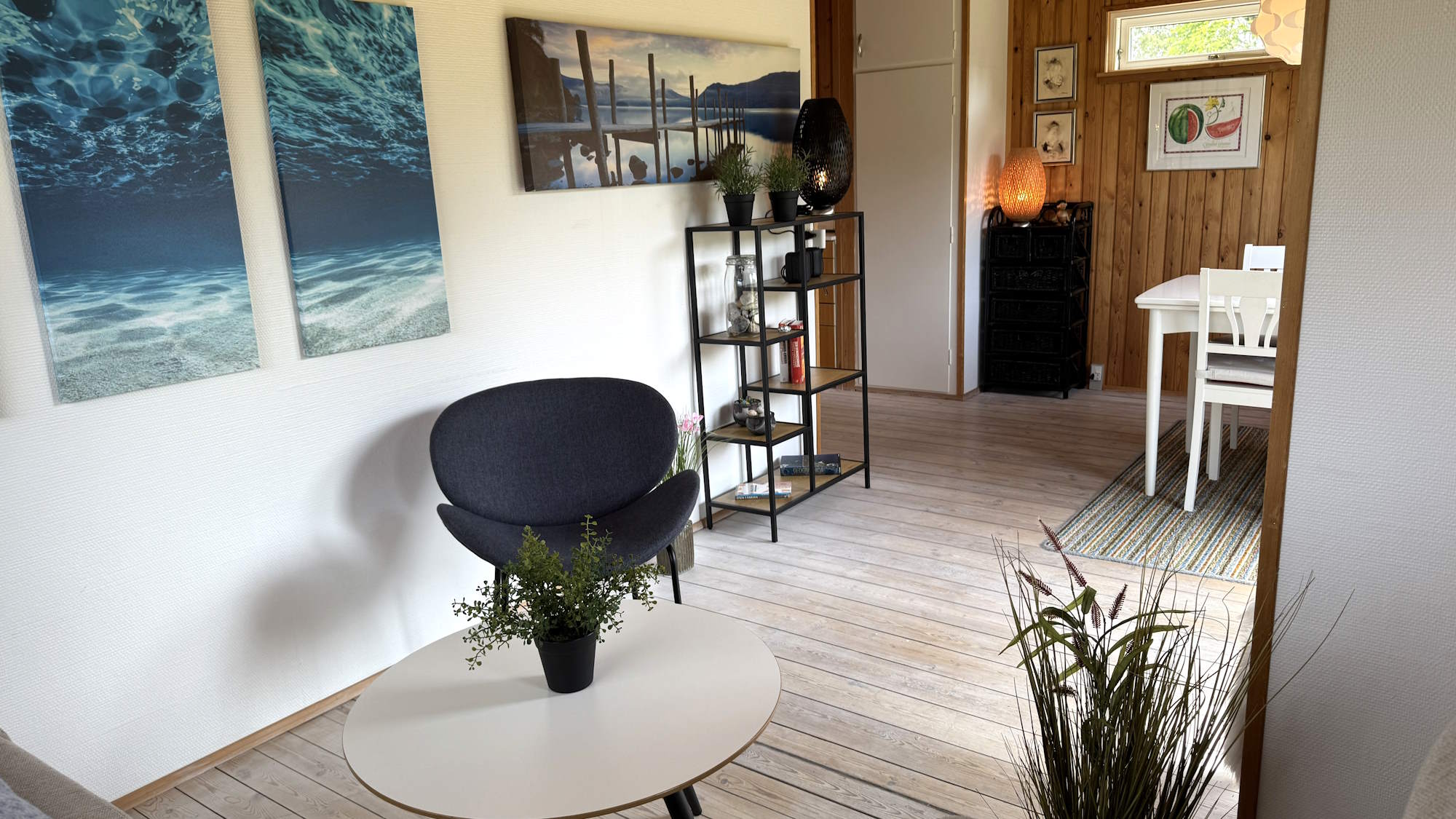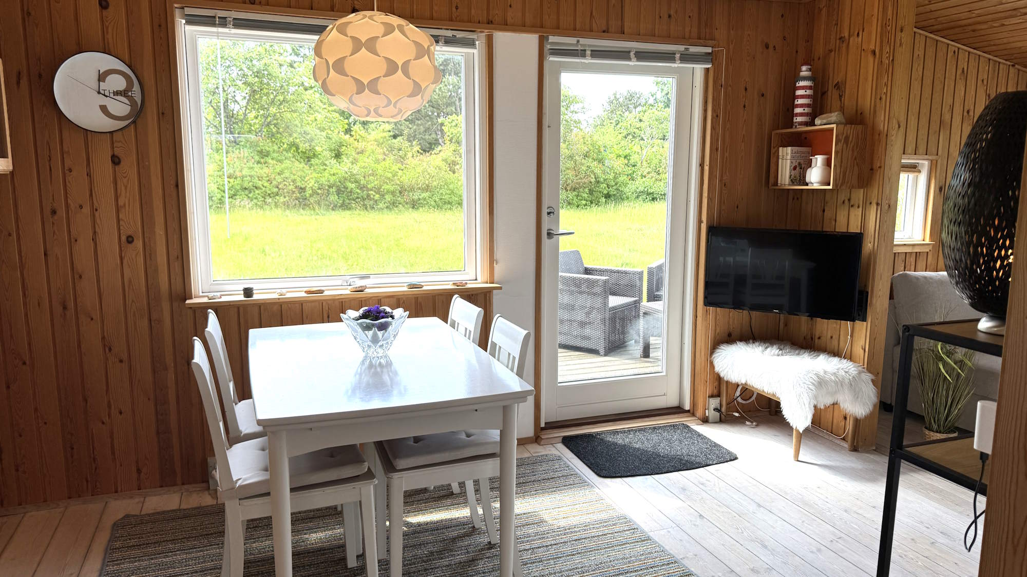 Stuen er indrettet med et spisebord til fire. Spisebordet har Hollandsk udtræk, så det kan blive næsten dobbelt så stort.