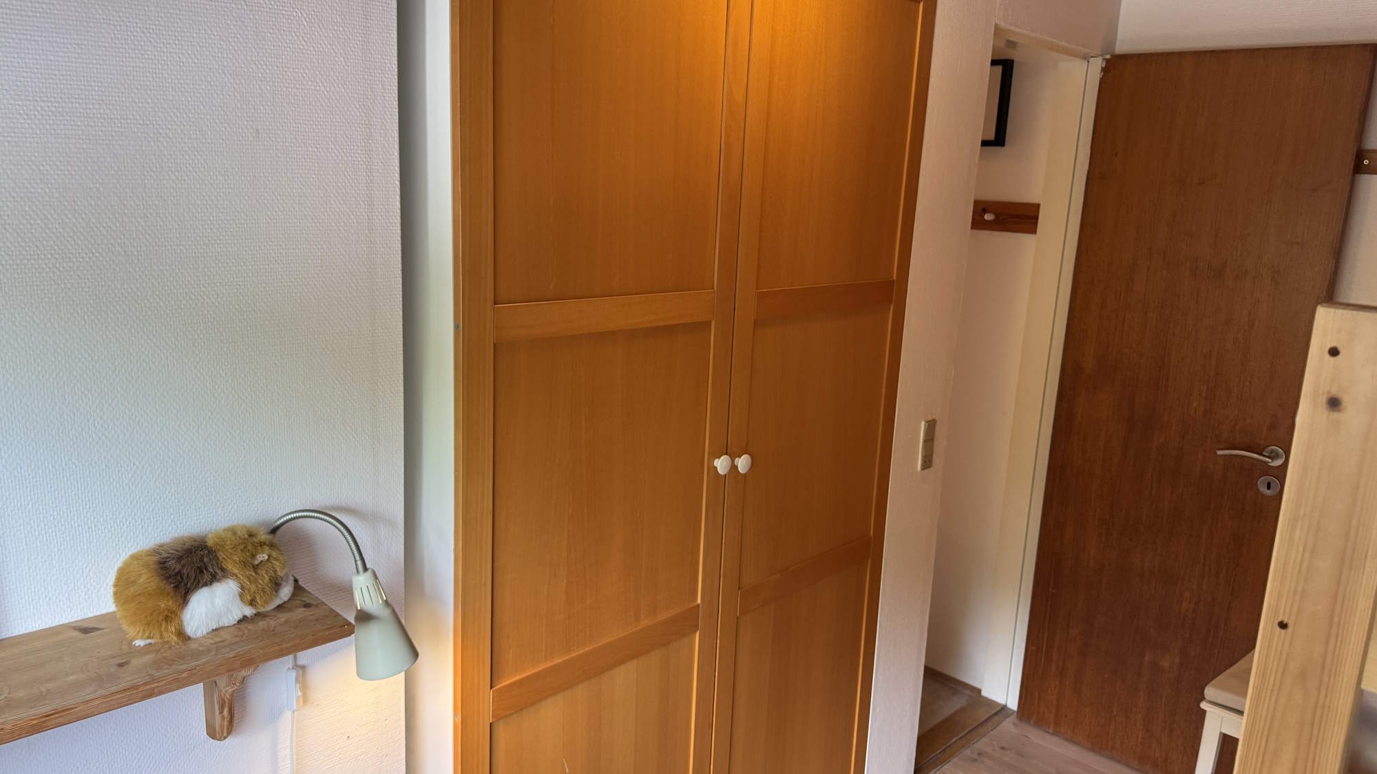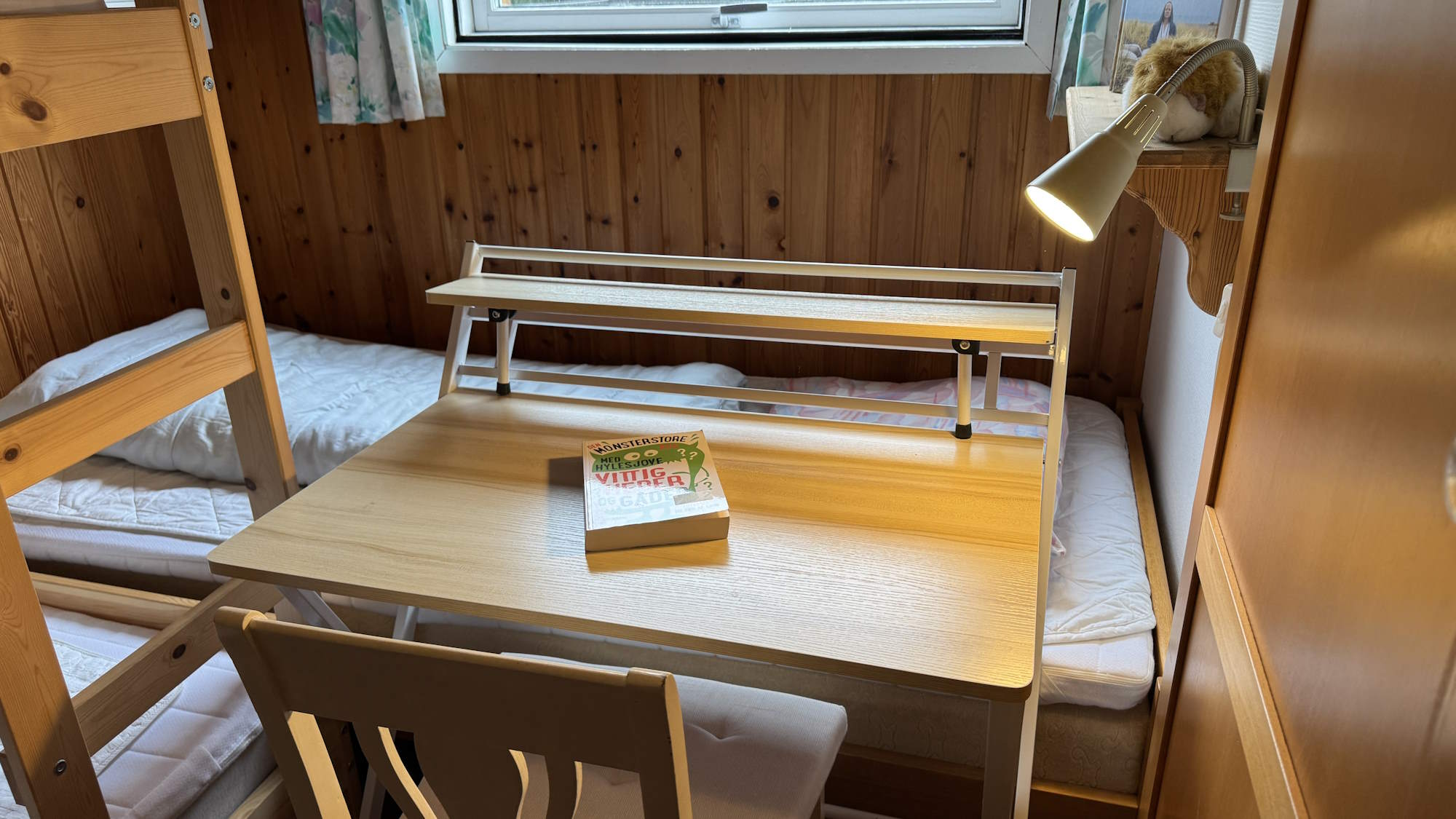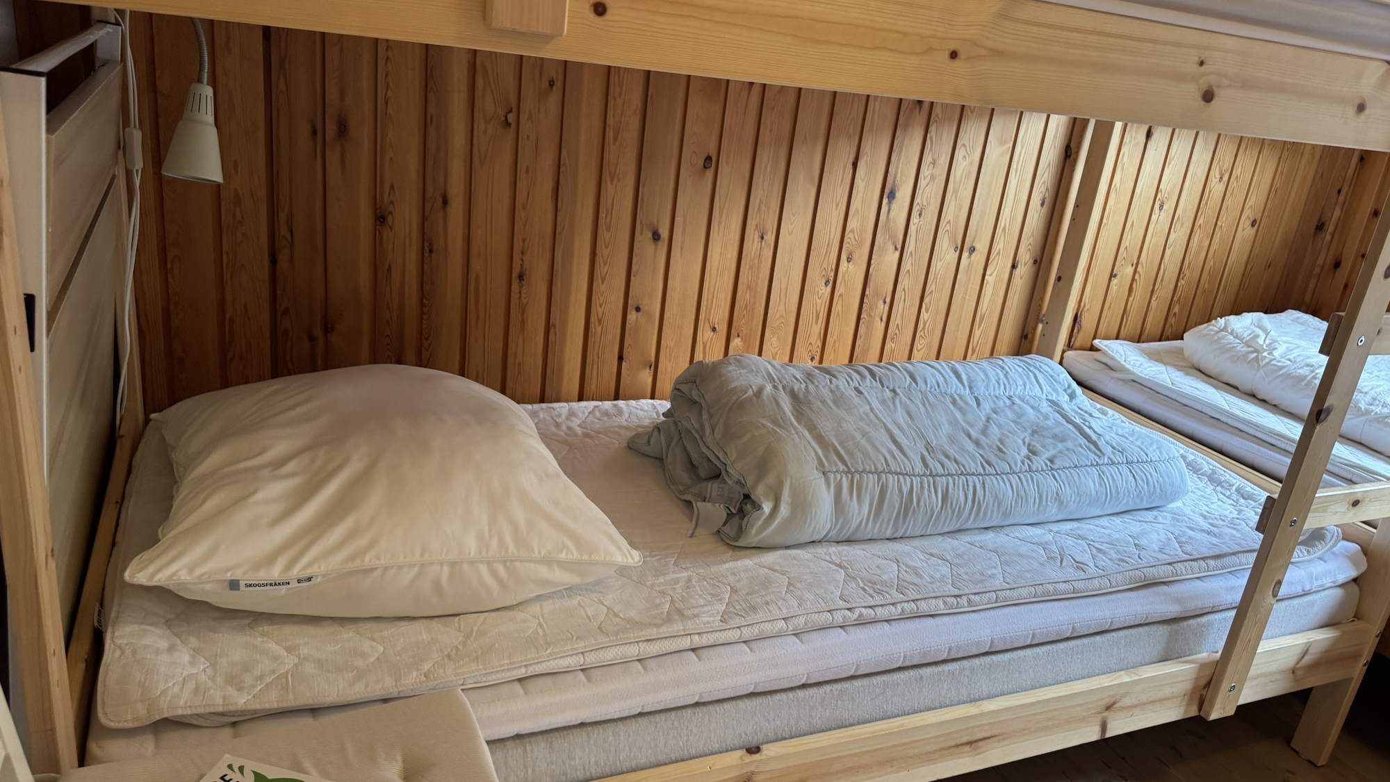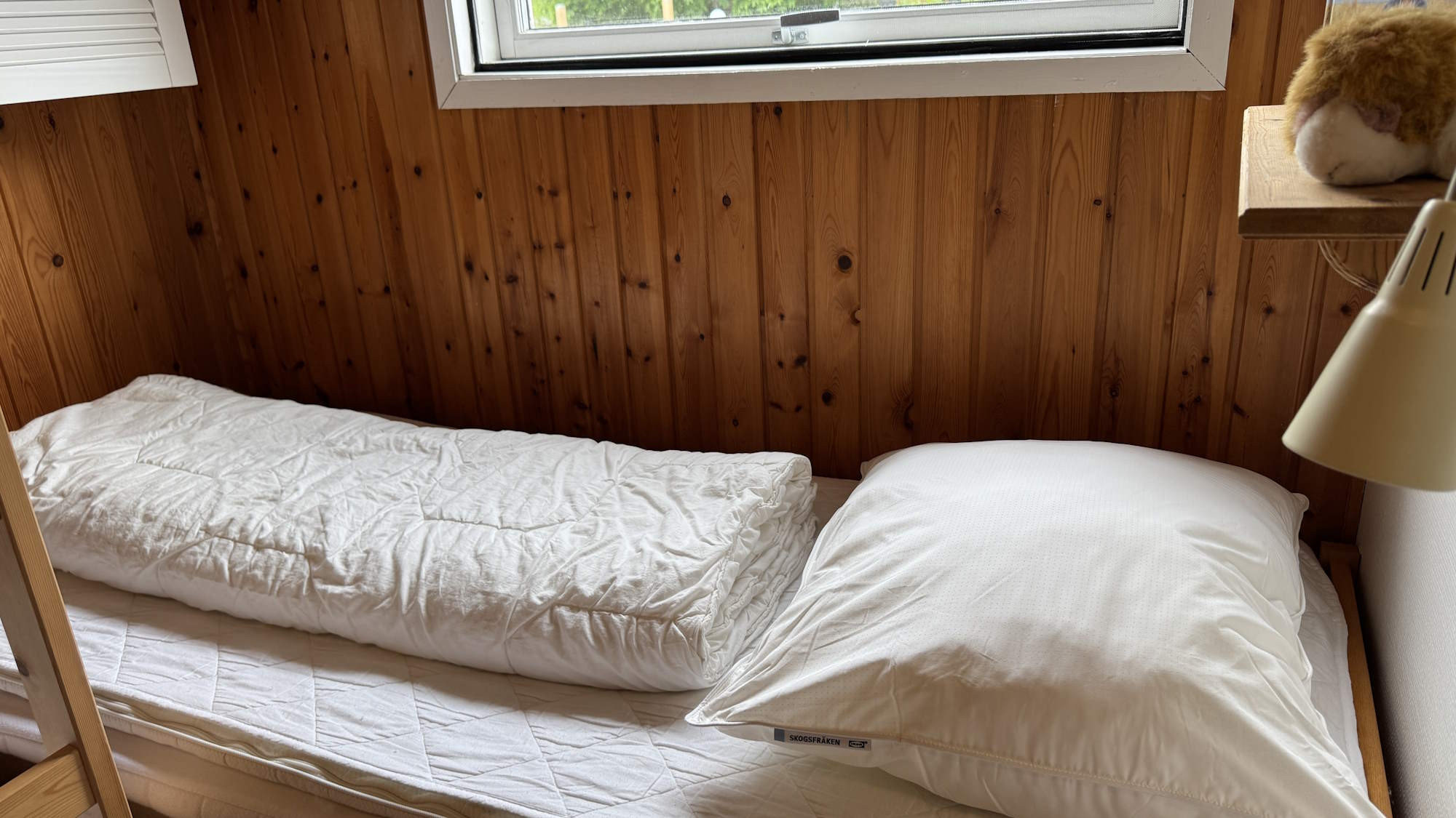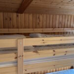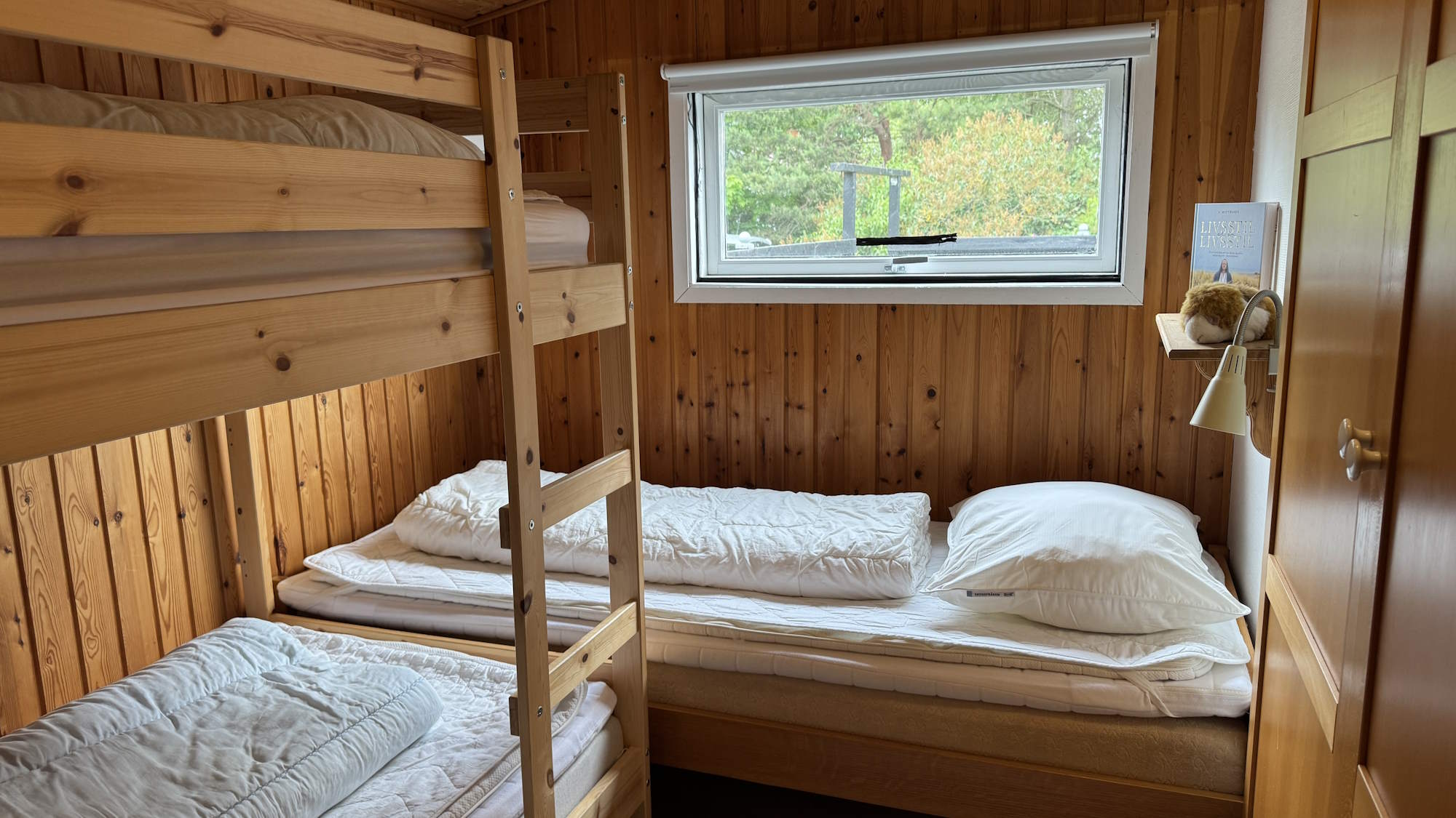 I soveværelset er der en seng (90 x 200 cm.) og en køjeseng med to sovepladser på 90 x 200. Der er mørklægningsgardin og insektnet for vinduet. I soveværelsets indbygningsskab er der en luftmadras (80 x 200), ekstra sengetøj – og god plads til jeres tøj.