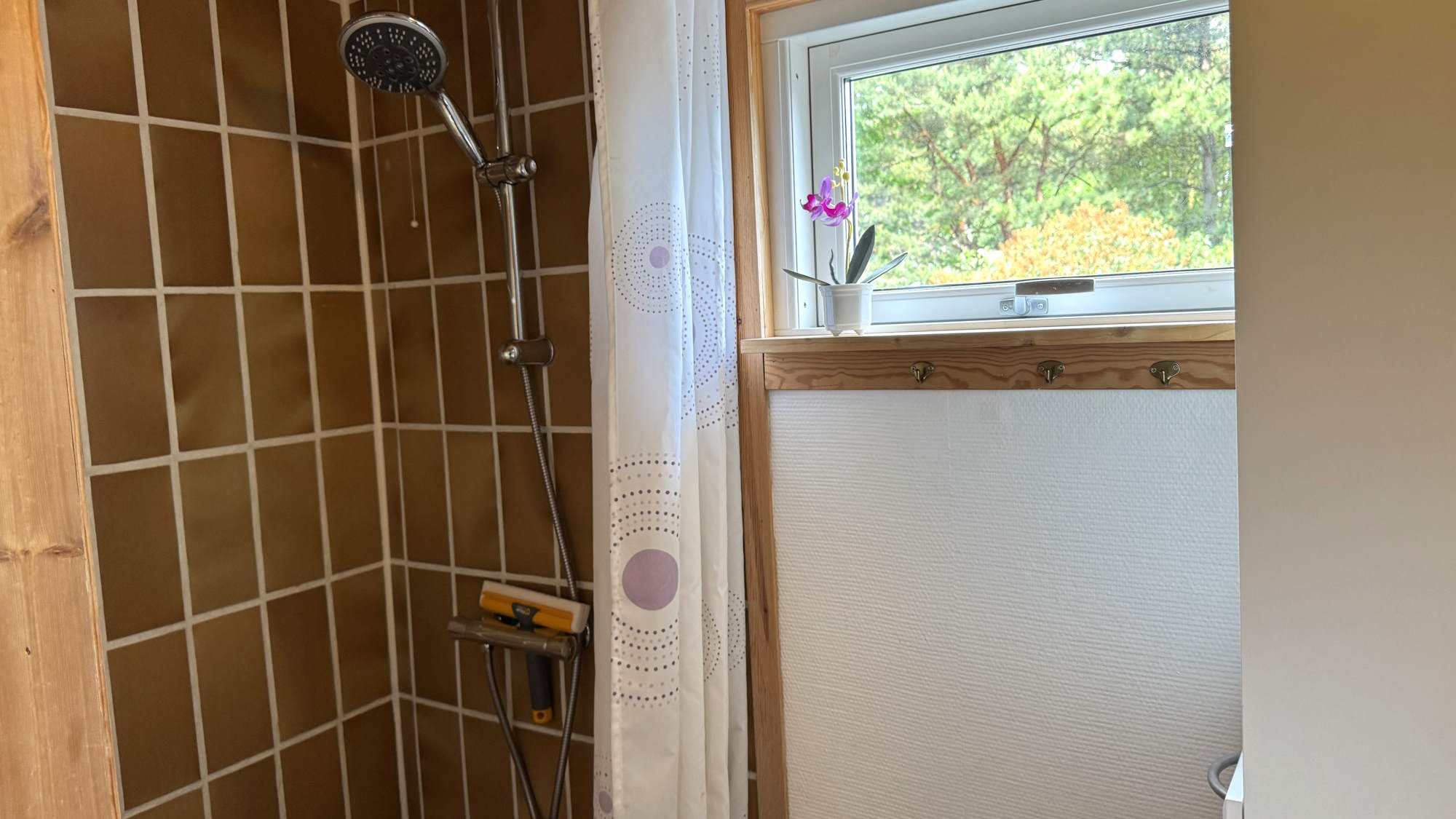 På badeværelset er der et toilet, håndvask, en bruser samt et skab til toiletsagerne og med ekstra håndklæder.