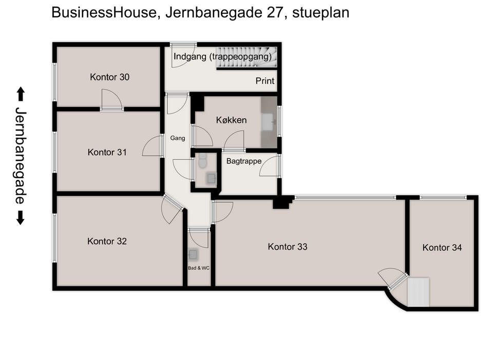 Fra dit nye kontor kan du følge med i livet i Jernbanegade og du er dermed helt automatisk en del af byens pulserende liv. På ét minut står du i Hovedbygningen eller Forhuset, hvor du har adgang til mødelokaler, Café, Lounge og mange andre fællesarealer.