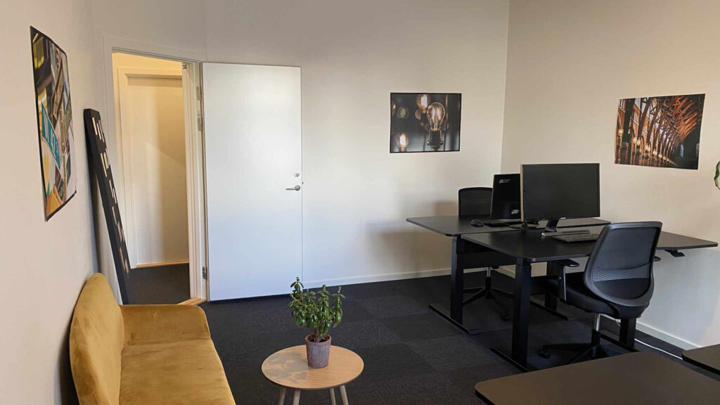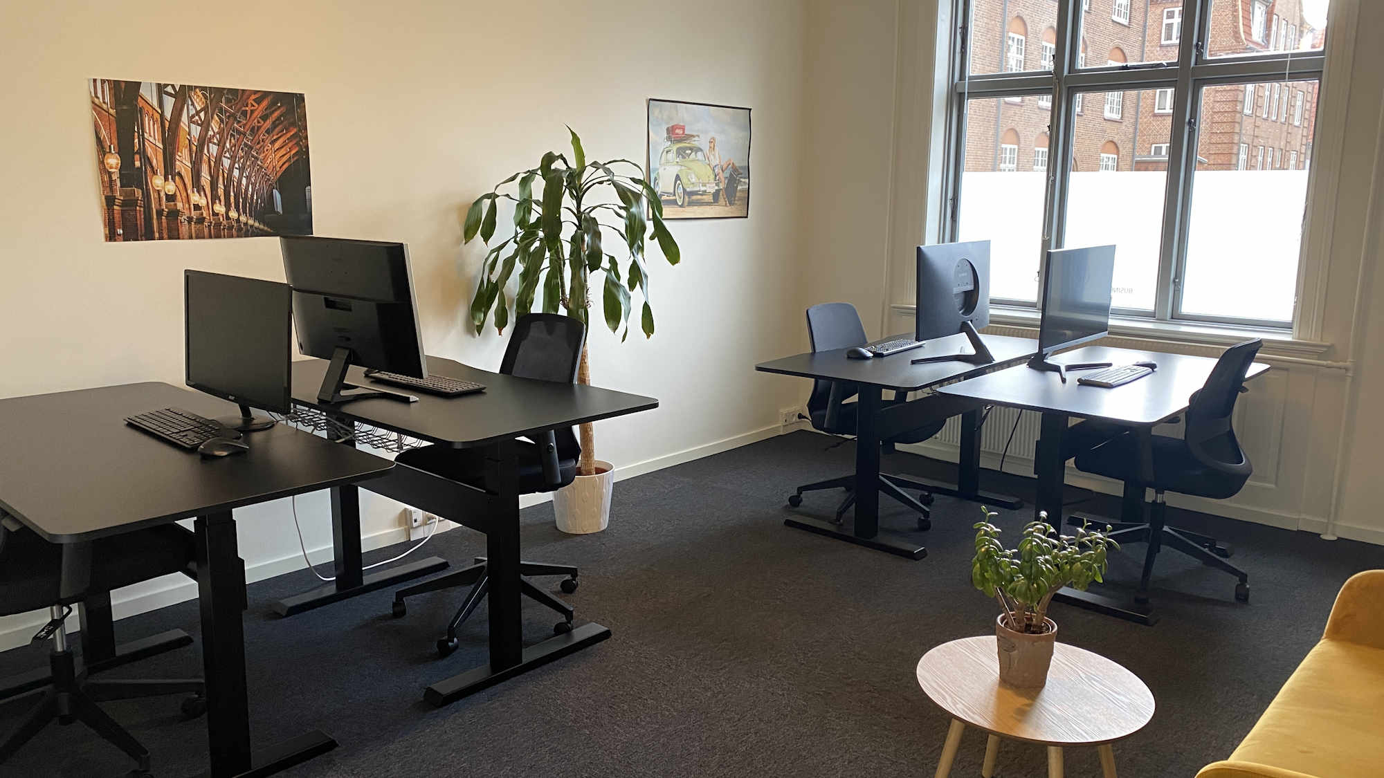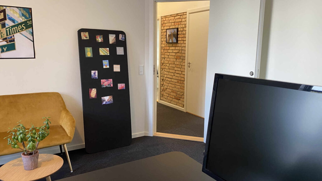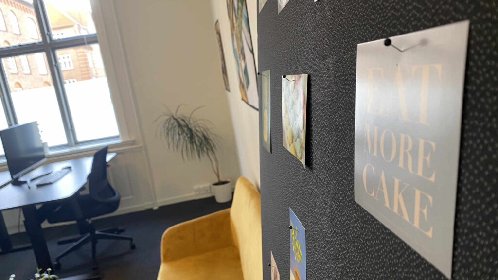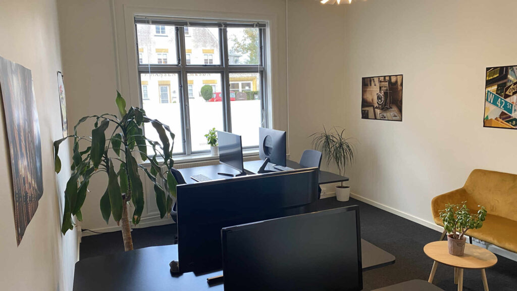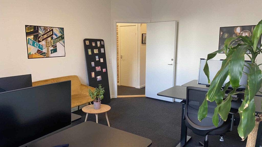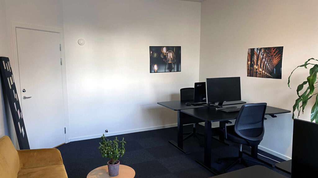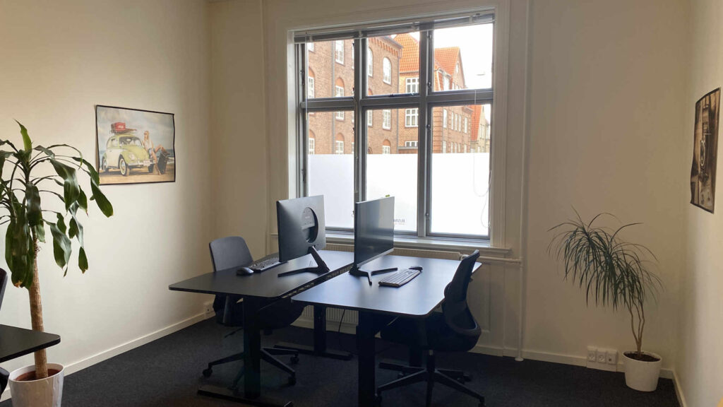 Kontoret er nemt at indrette til f.eks. fire arbejdspladser eller to arbejdspladser og eget mødebord. På væggene kan du snildt få plads til et eller flere whiteboards.