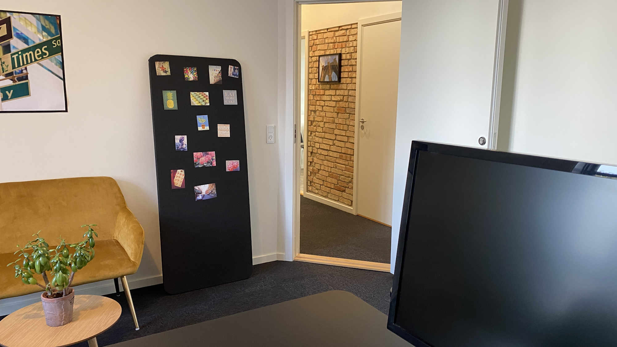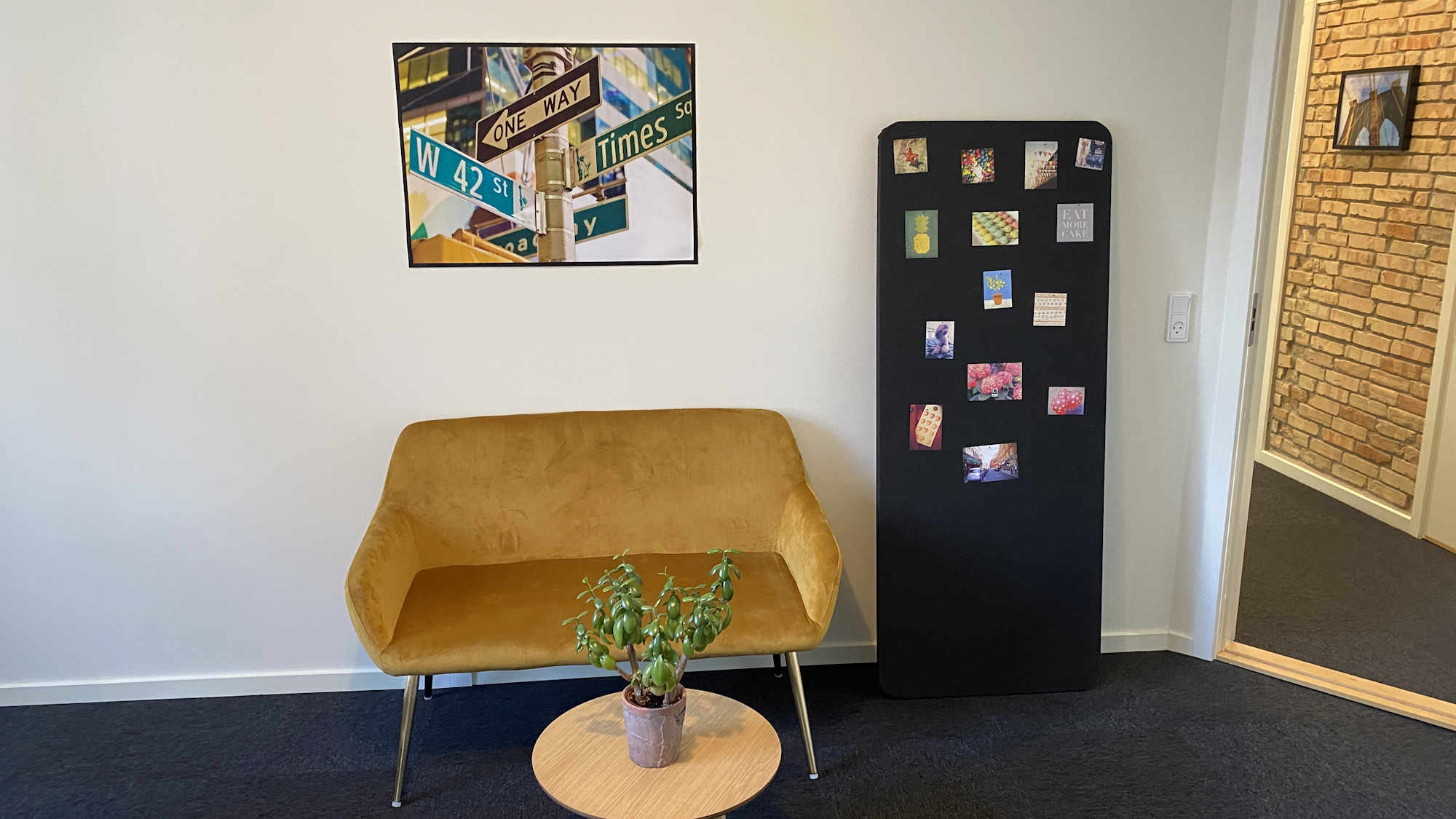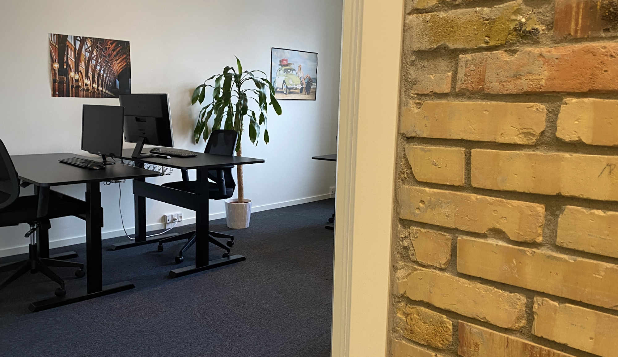 Få et kontor i ægte Newyorkerstil. Rå mursten i gangen, råhvide vægge og mørke matchende tæppefliser i dit nye kontor.