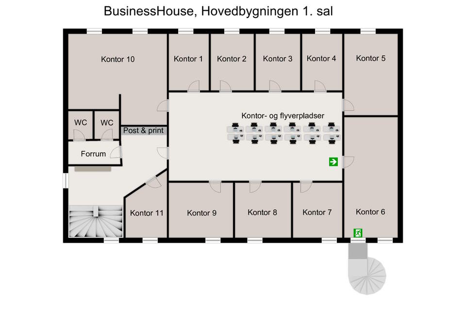 To skridt fra døren til kontoret er vores åbne kontorlandskab, hvor der bl.a. er flyverpladser. Dette giver en helt unik mulighed for at du kan “udvide” kontoret, hvis du af og til har brug for at have praktikanter, projektansatte, studentermedhjælpere eller andre, som du ønsker skal være helt tæt på dit kontor.