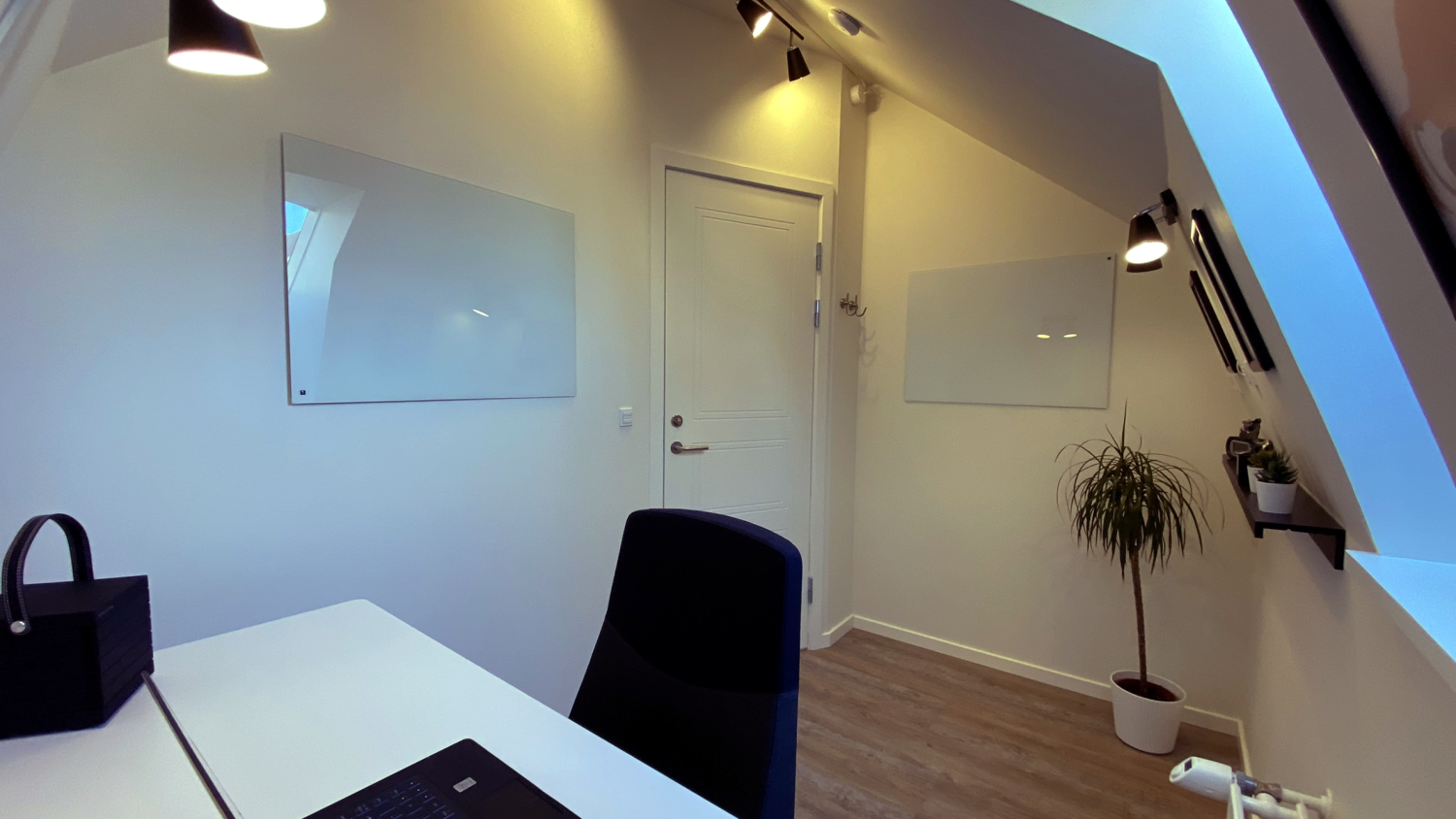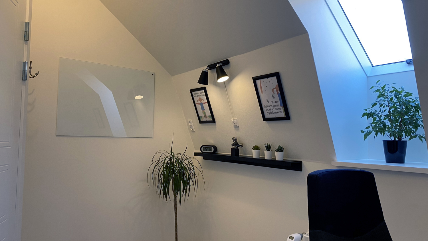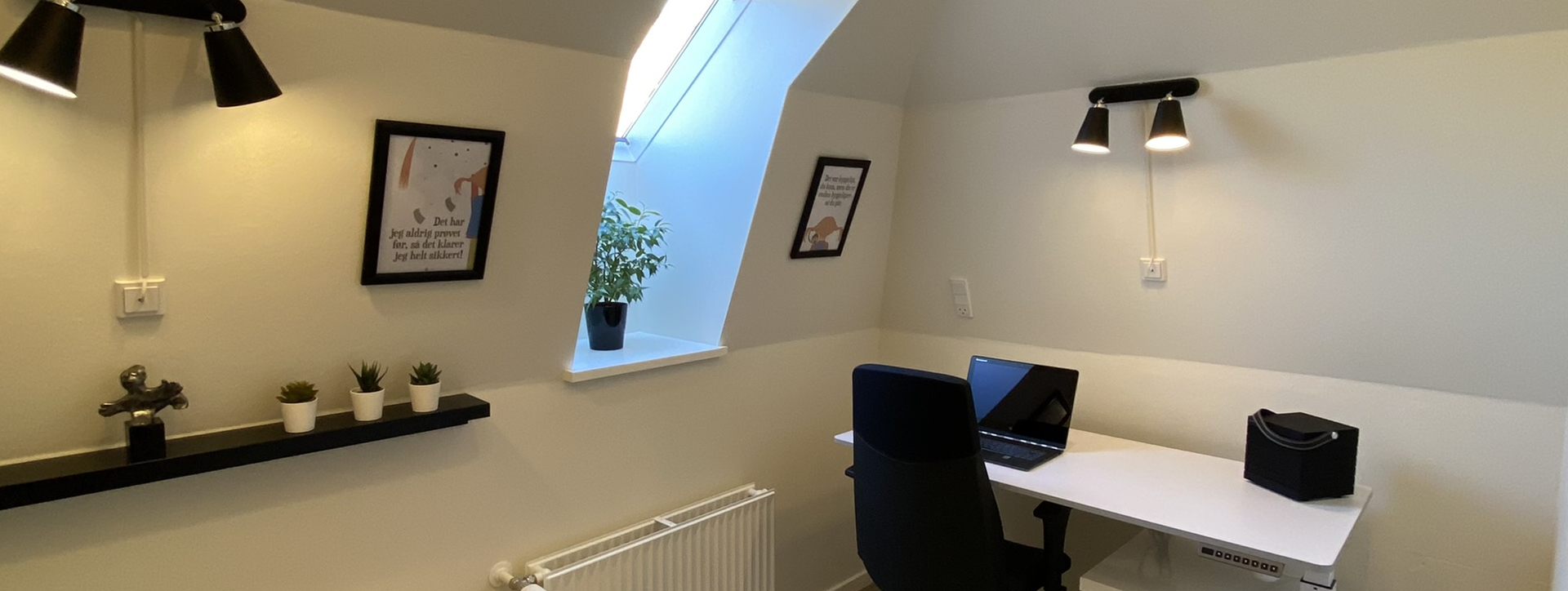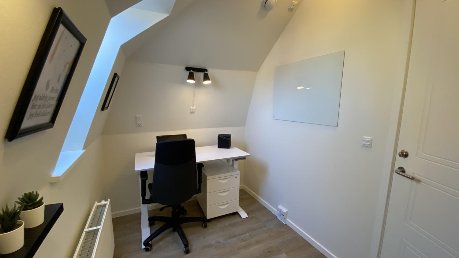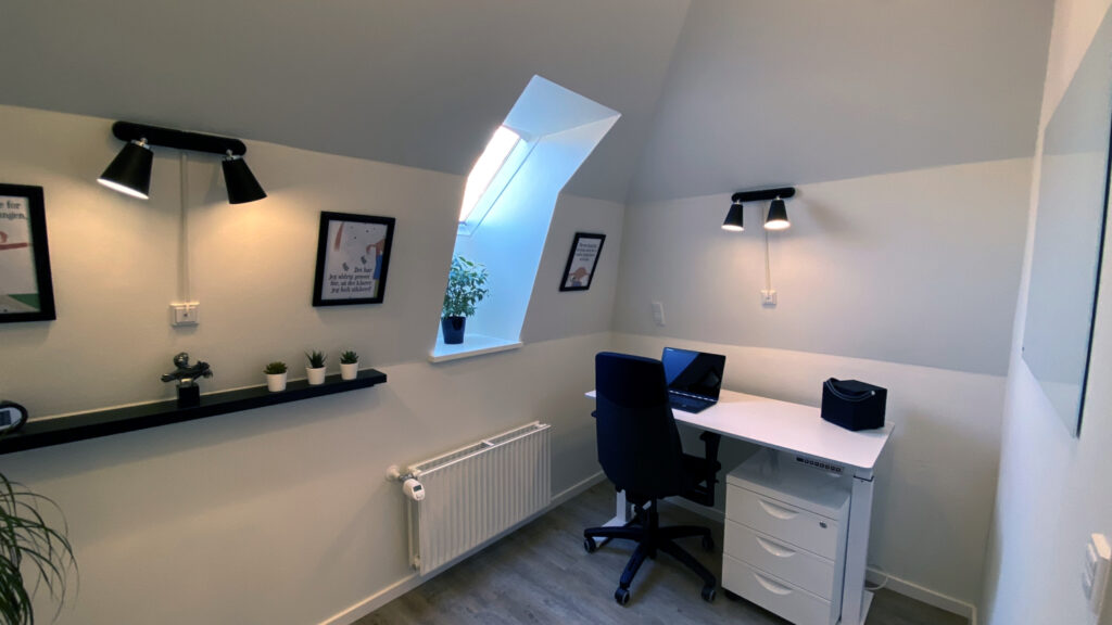 Lige nu har vi opsat et skrivebord med smart hæve/sænkefunktion og en ergonomisk kontorstol – men du kan naturligvis indrette kontoret, som du ønsker det.
