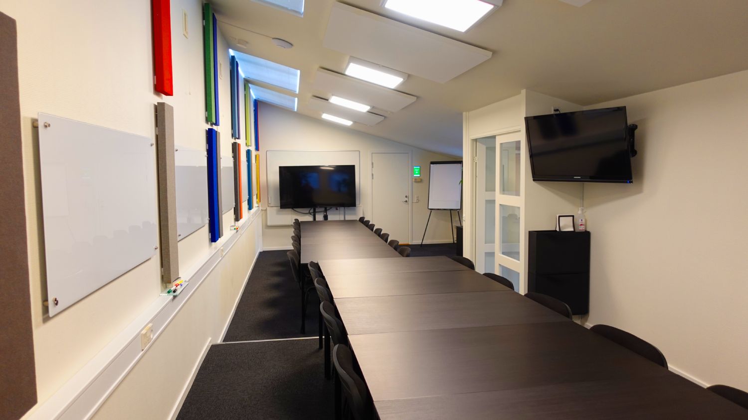65" skærm, konferencesystem, 20 glastavler og flip-over.